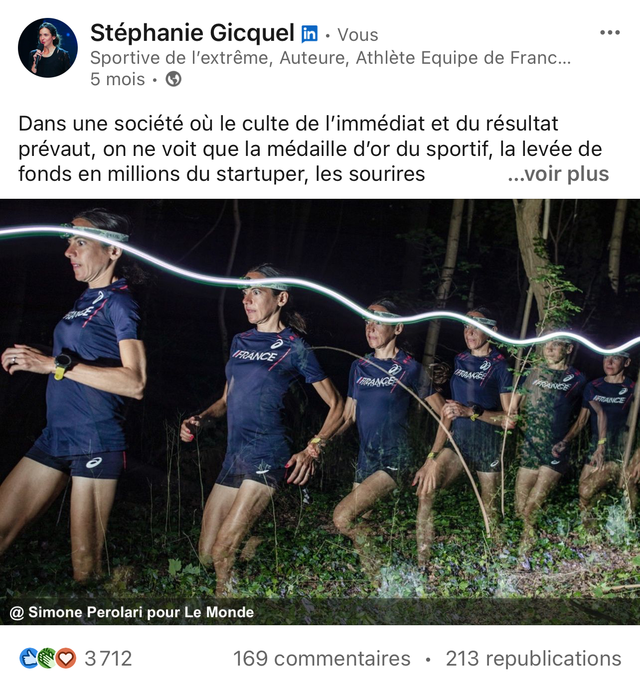 Idem quand je me suis lancée dans le sport de haut niveau : on me disait que c’était trop tard pour moi, impossible. Cette douce musique berce de tout temps les conquérants. Je n’ai pas compté les chutes et les blessures, ni les mois et les années pour adapter mon corps, assimiler l’effort, améliorer le geste jusqu’à remporter des médailles internationales et améliorer un record de France d’athlétisme en courant plus de 6 marathons à la suite en 24 heures (253,6km).